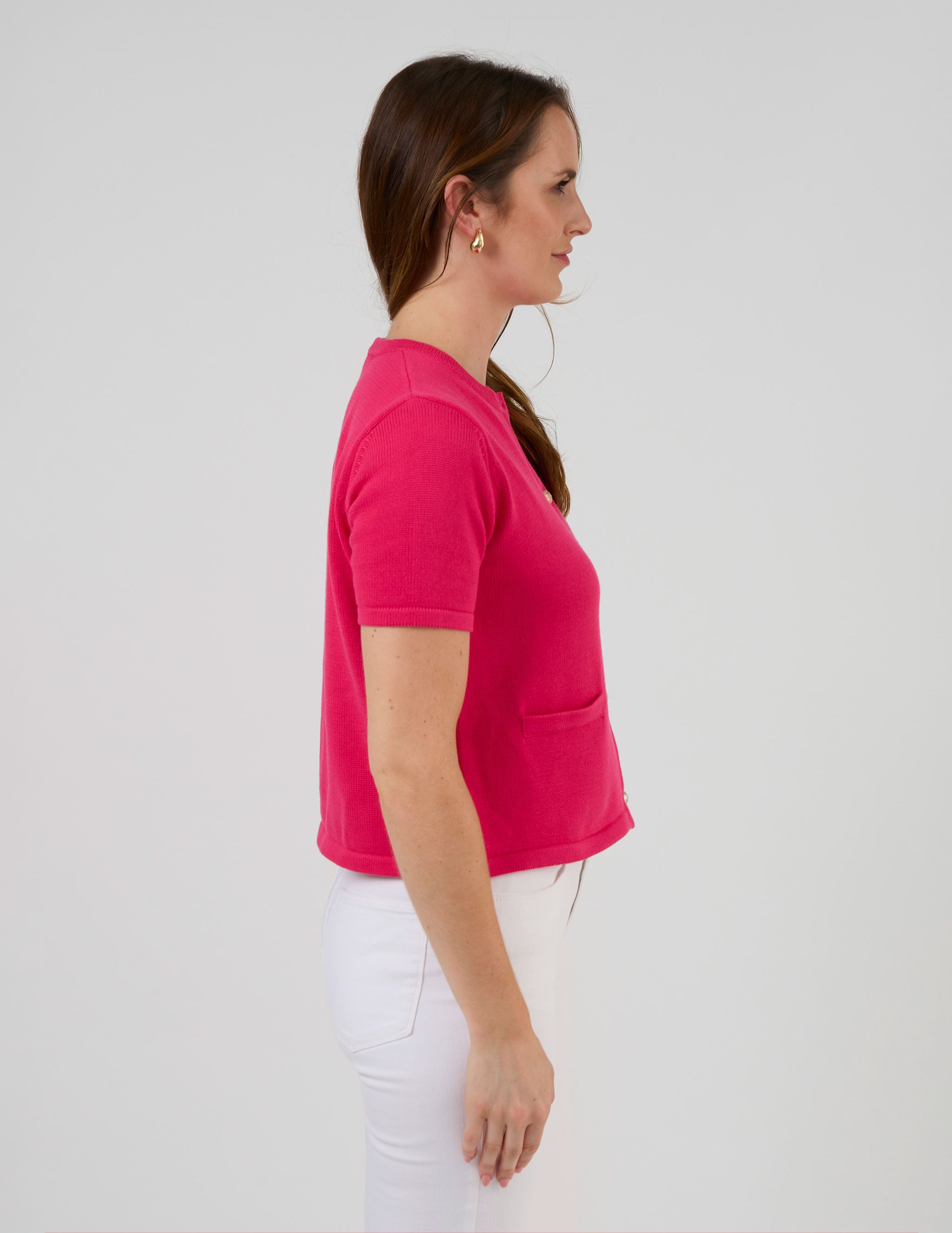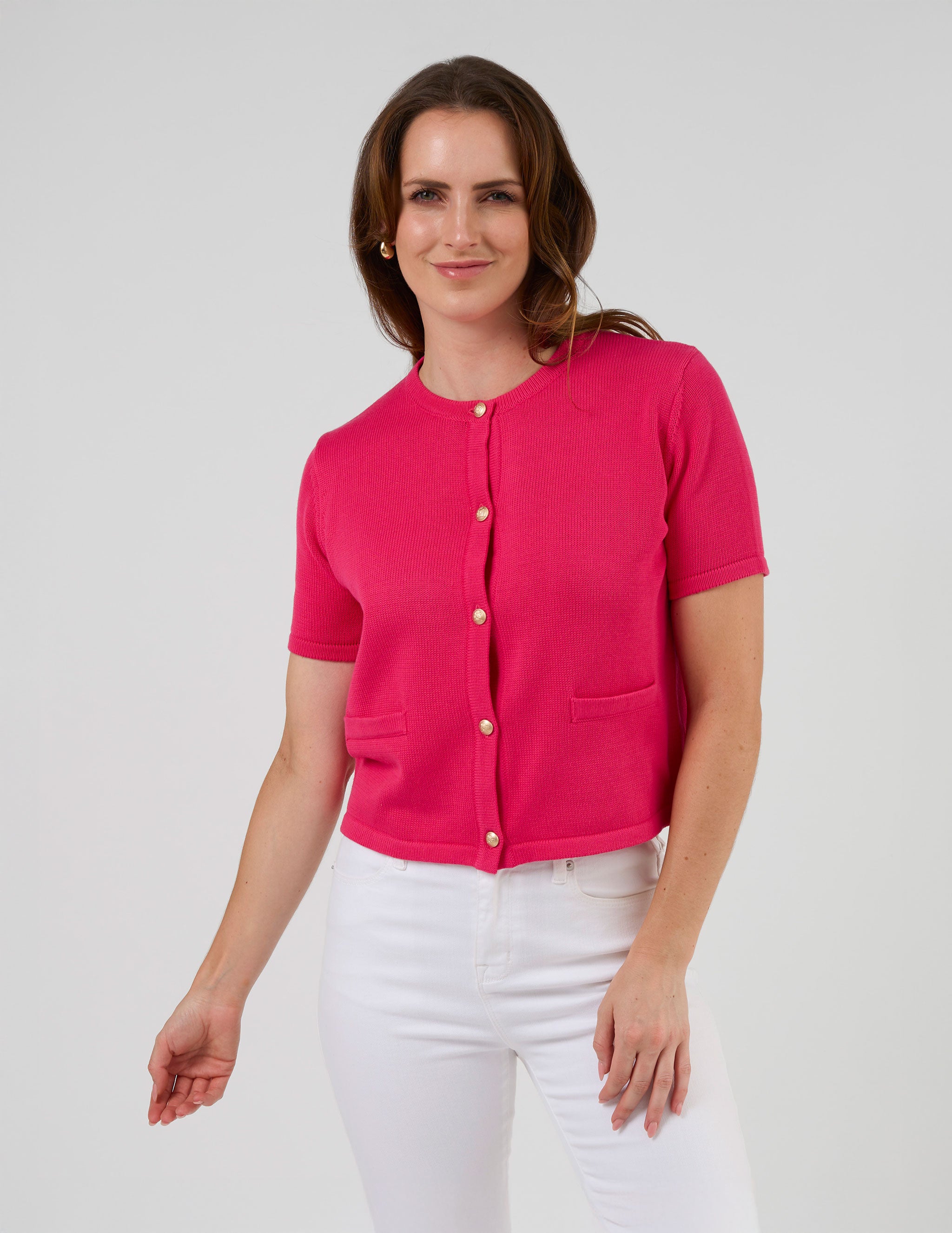Short sleeve crew neck cardigan with gold novelty buttons and mock welt pocket detail