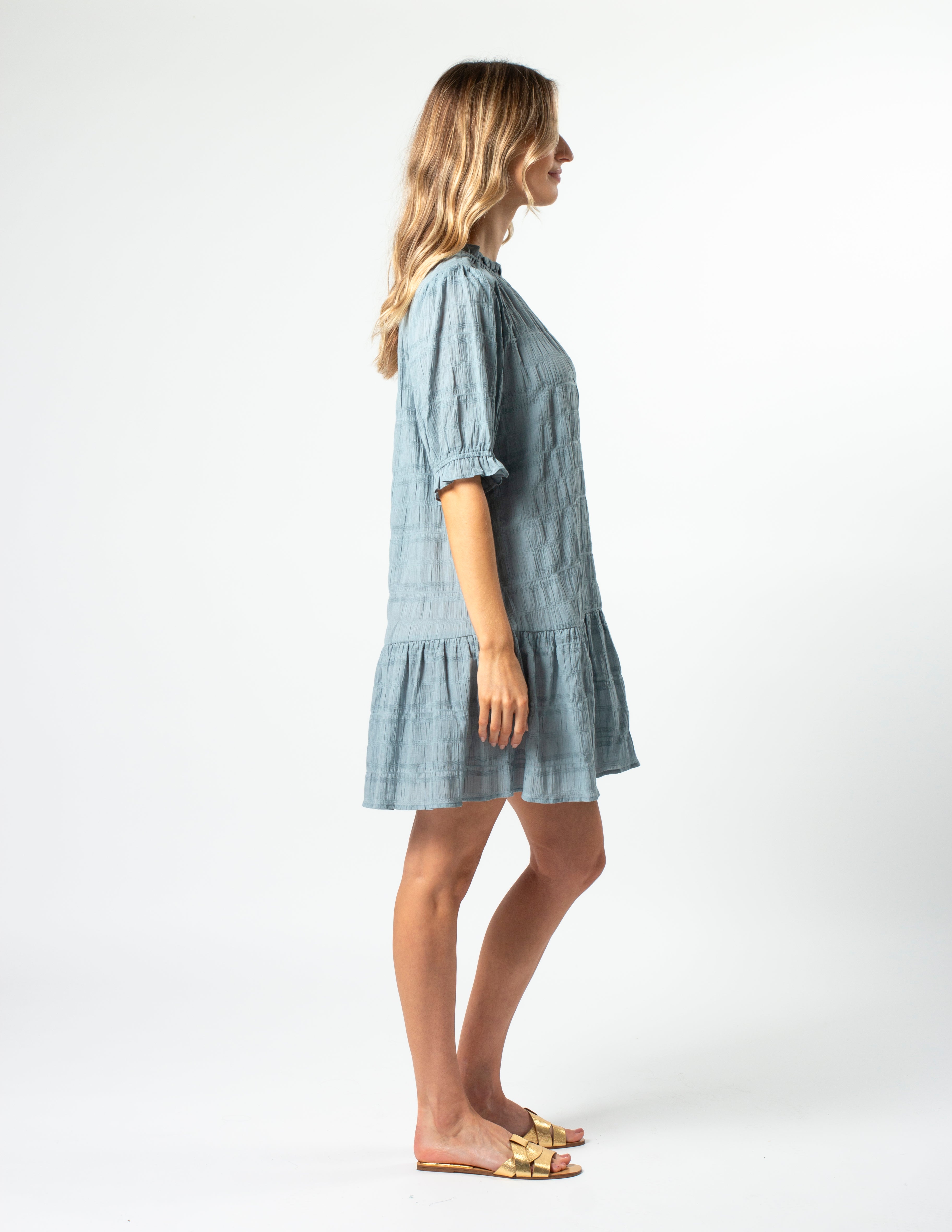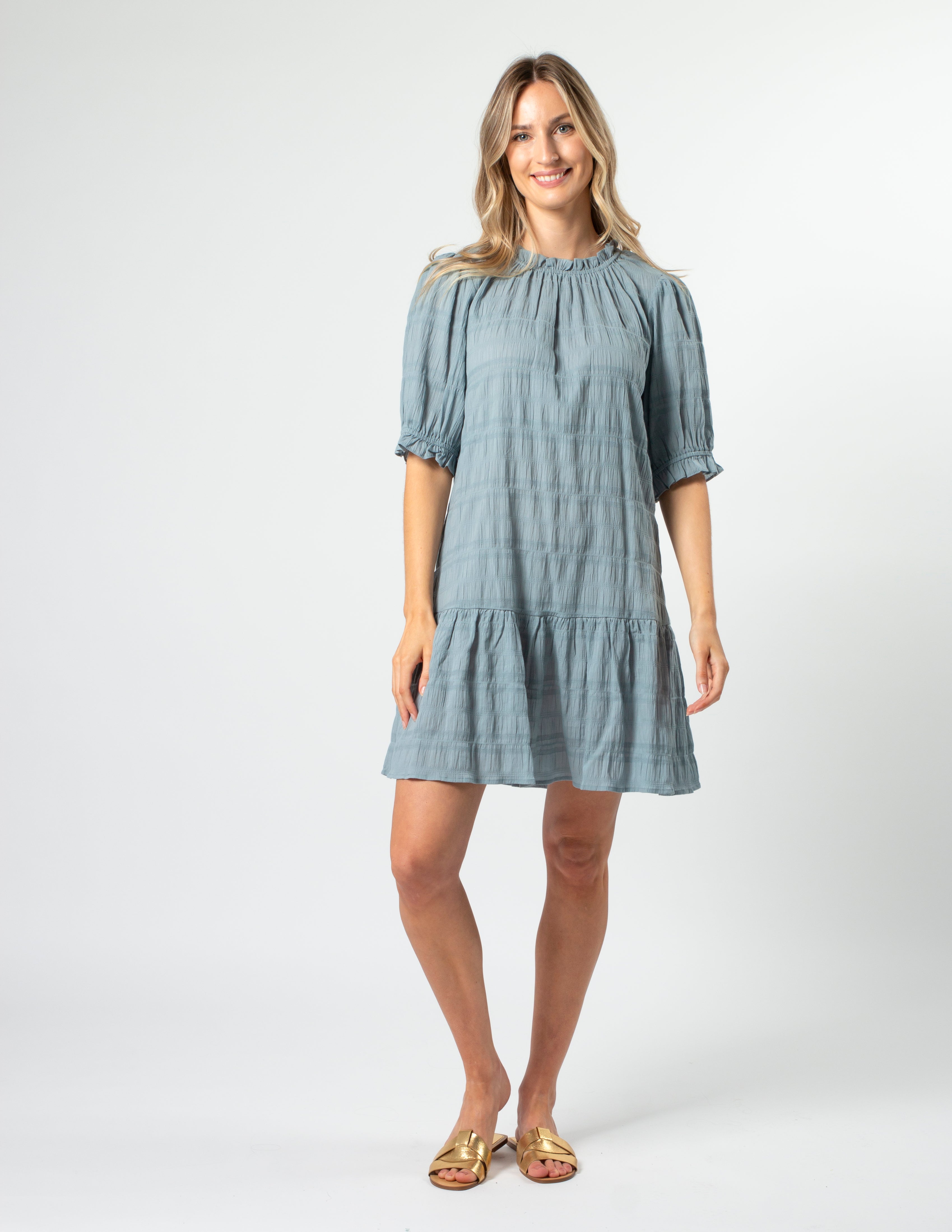 Textured mid thigh length dress with gathered one tier hemline. Elasticated frill crewneck and elbow length sleeve with elasticated cuff and frill