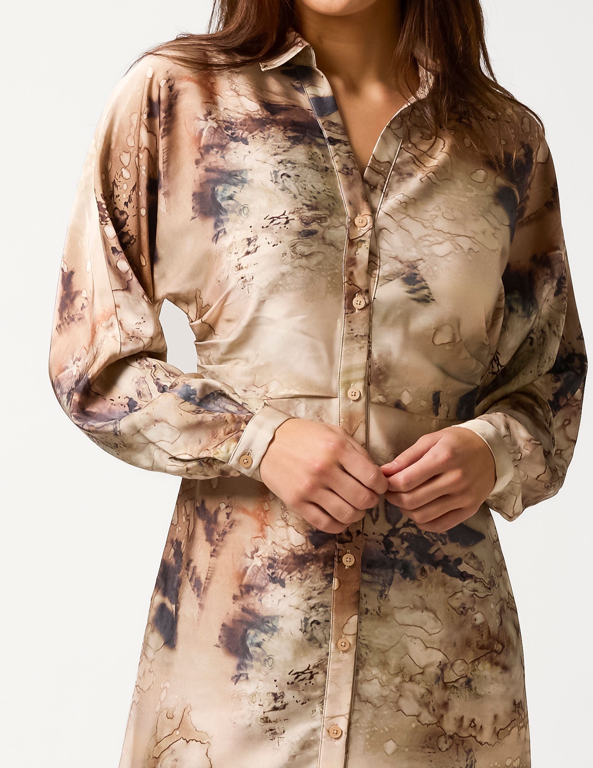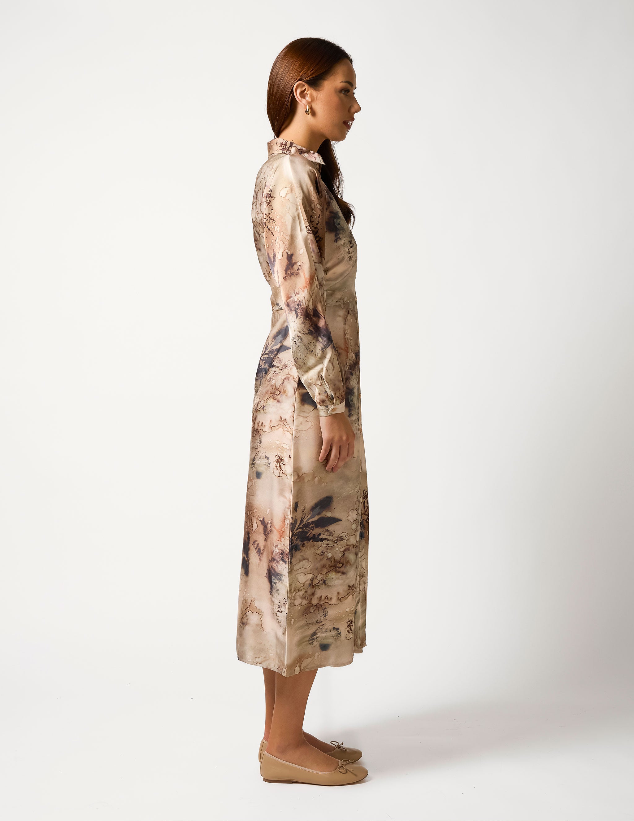 Open neckline midi dress with collar and button front placket. Long slim batwing sleeve and fitted waist shaping.