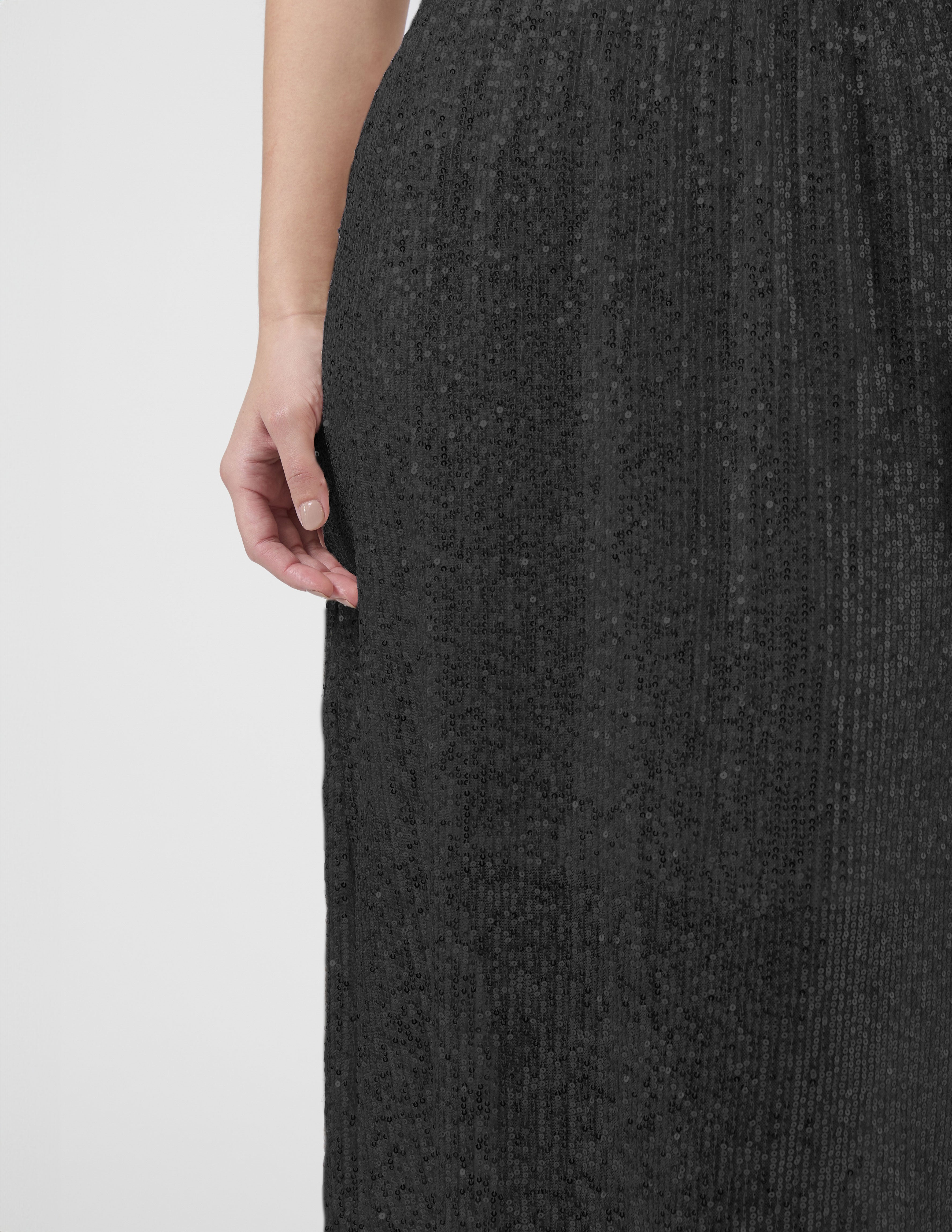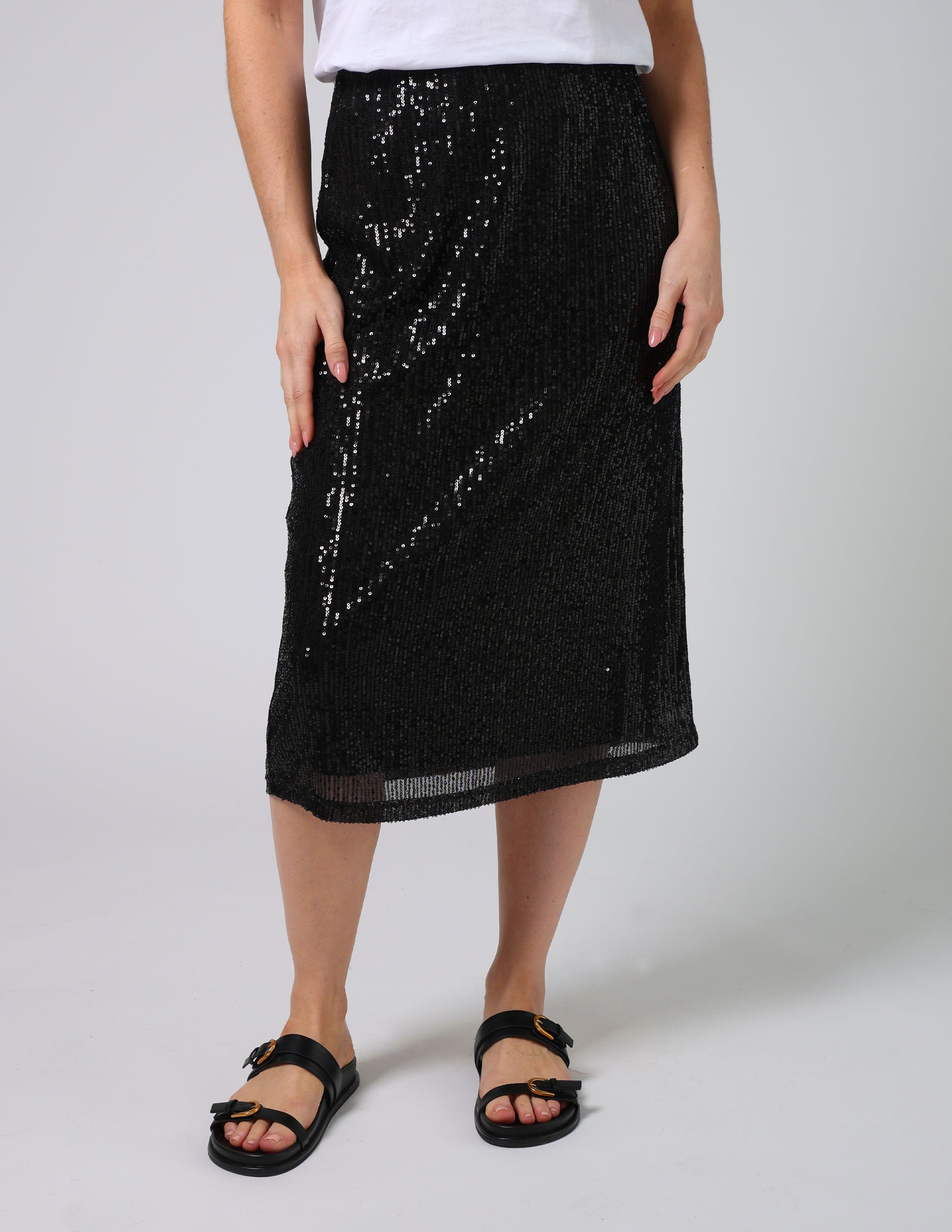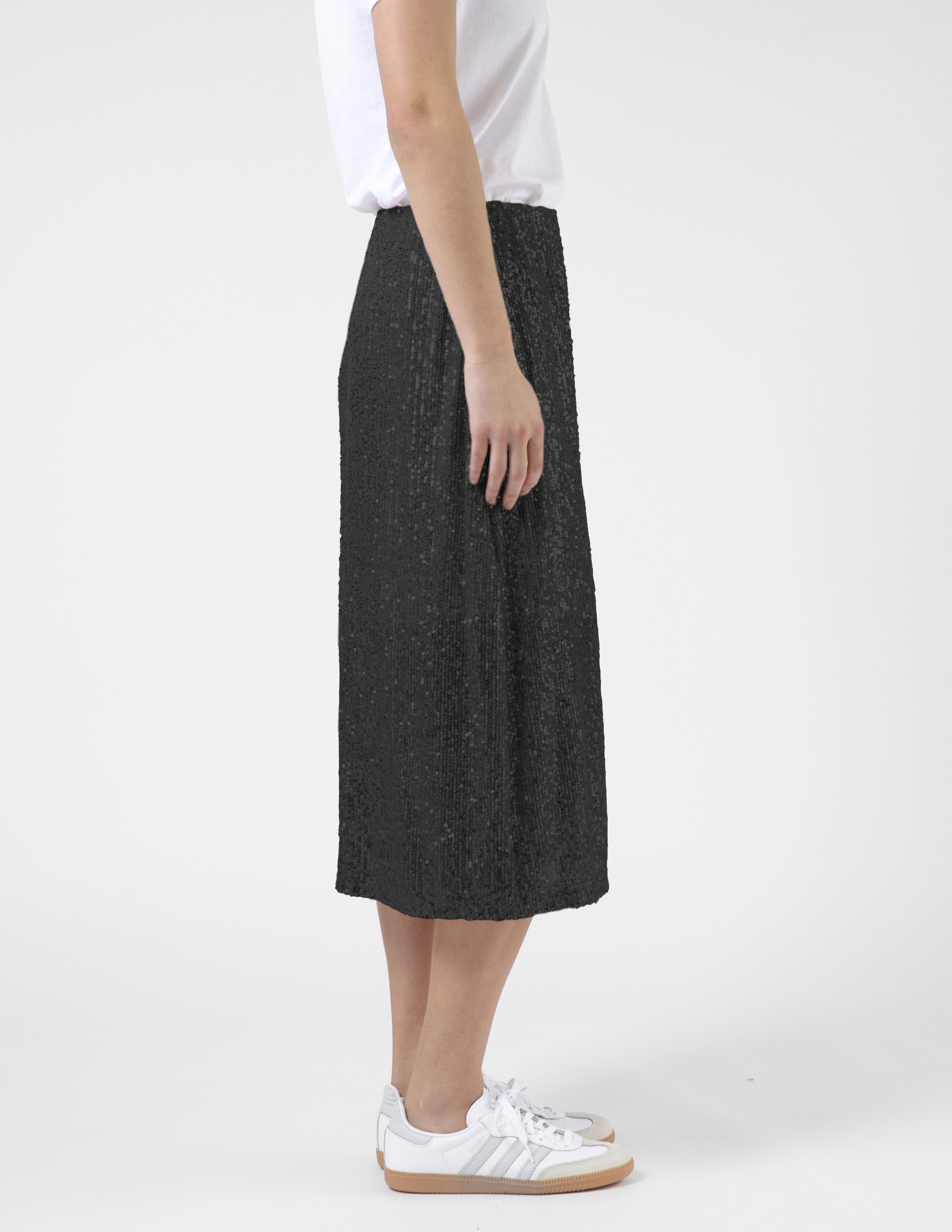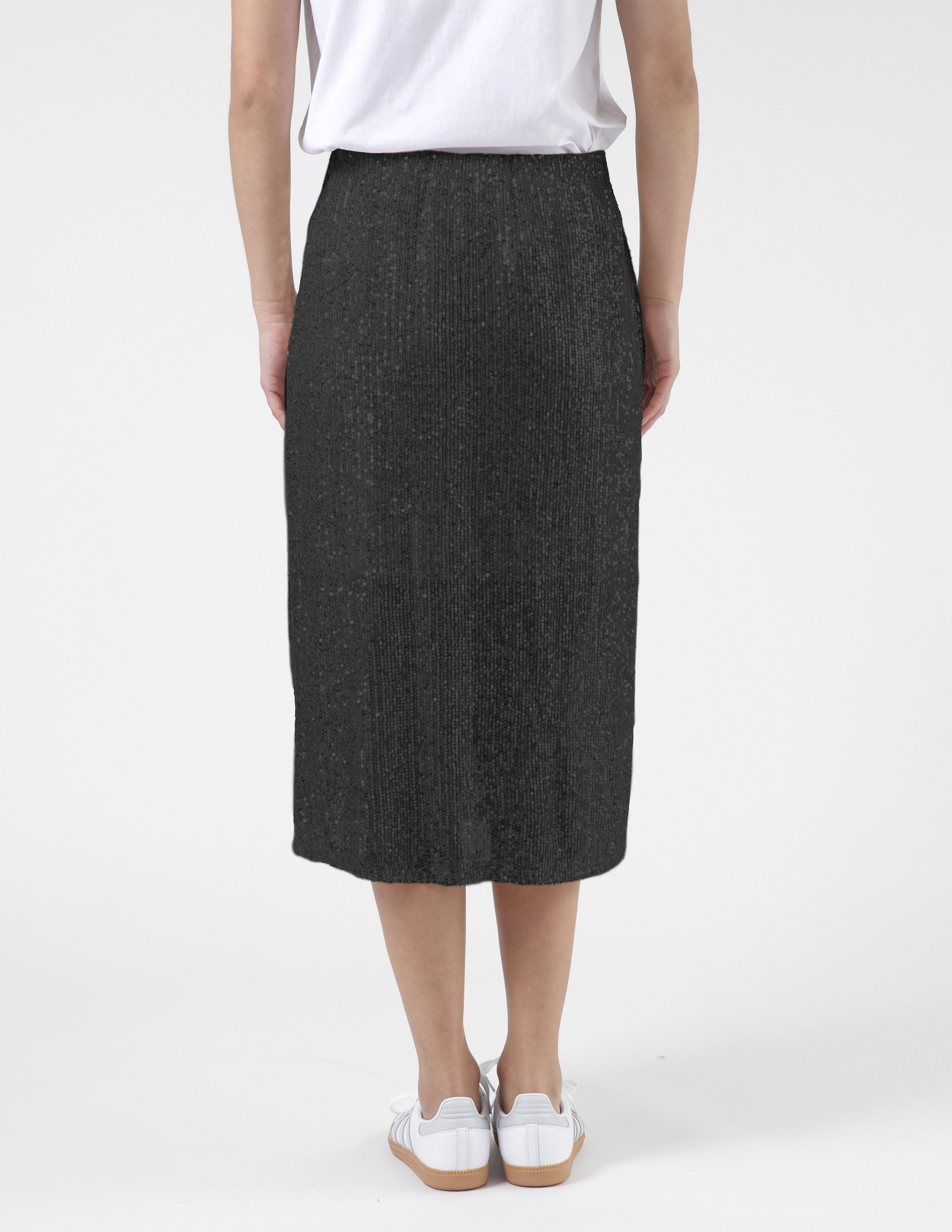 Sequinned midi skirt with elasticated waist. Fully lined
