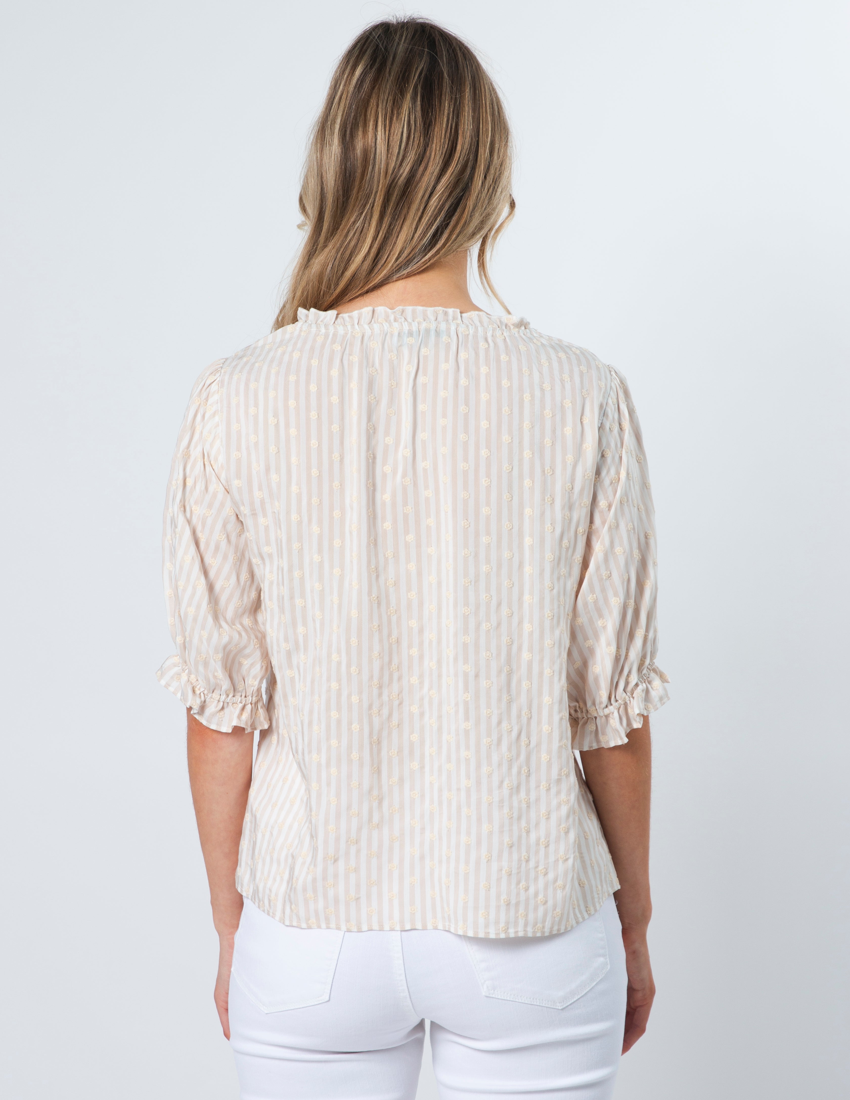Tie neck blouse with keyhole neckline and ruffle trim on neck and cuffs. Textured self stripe fabric with small embroidery flower