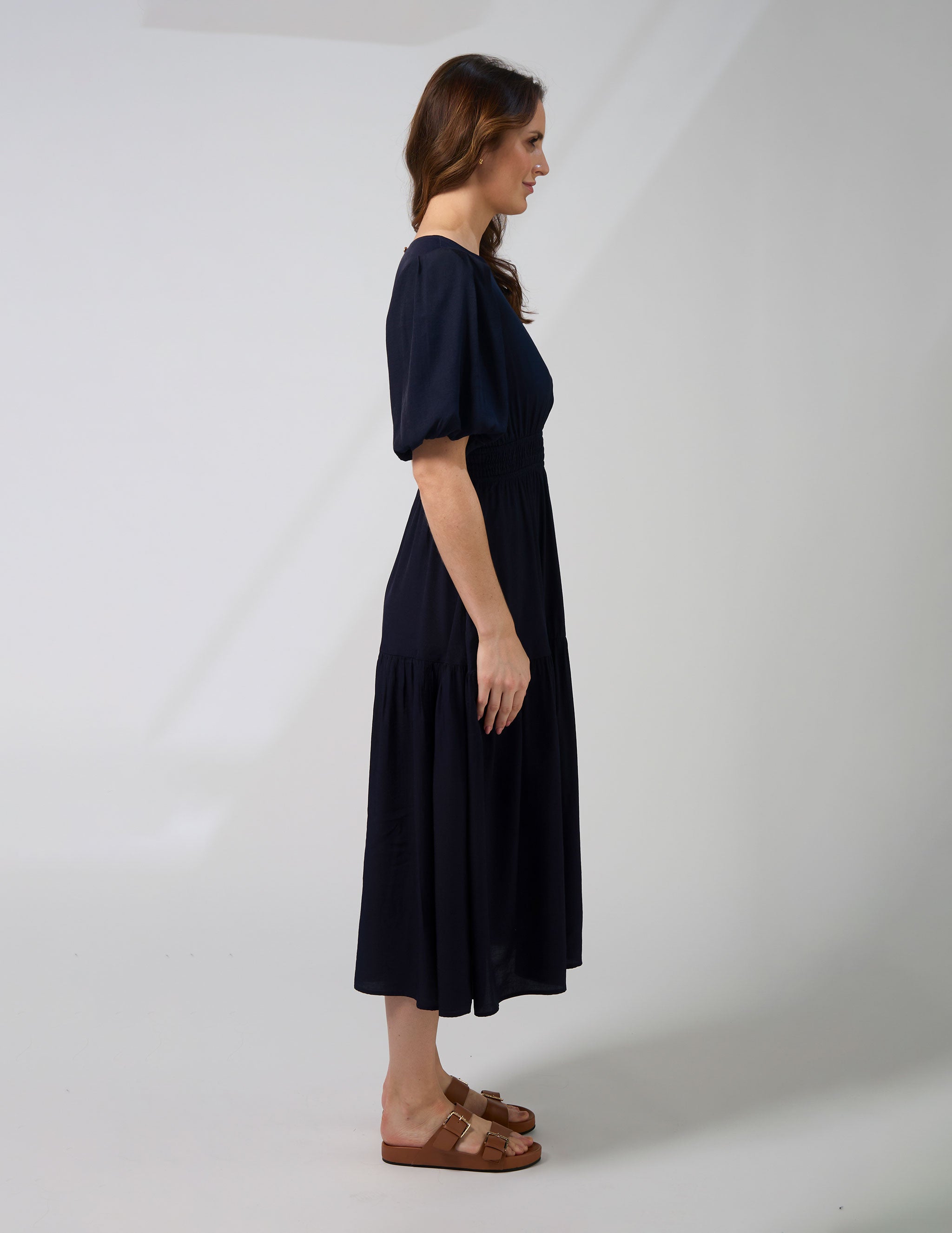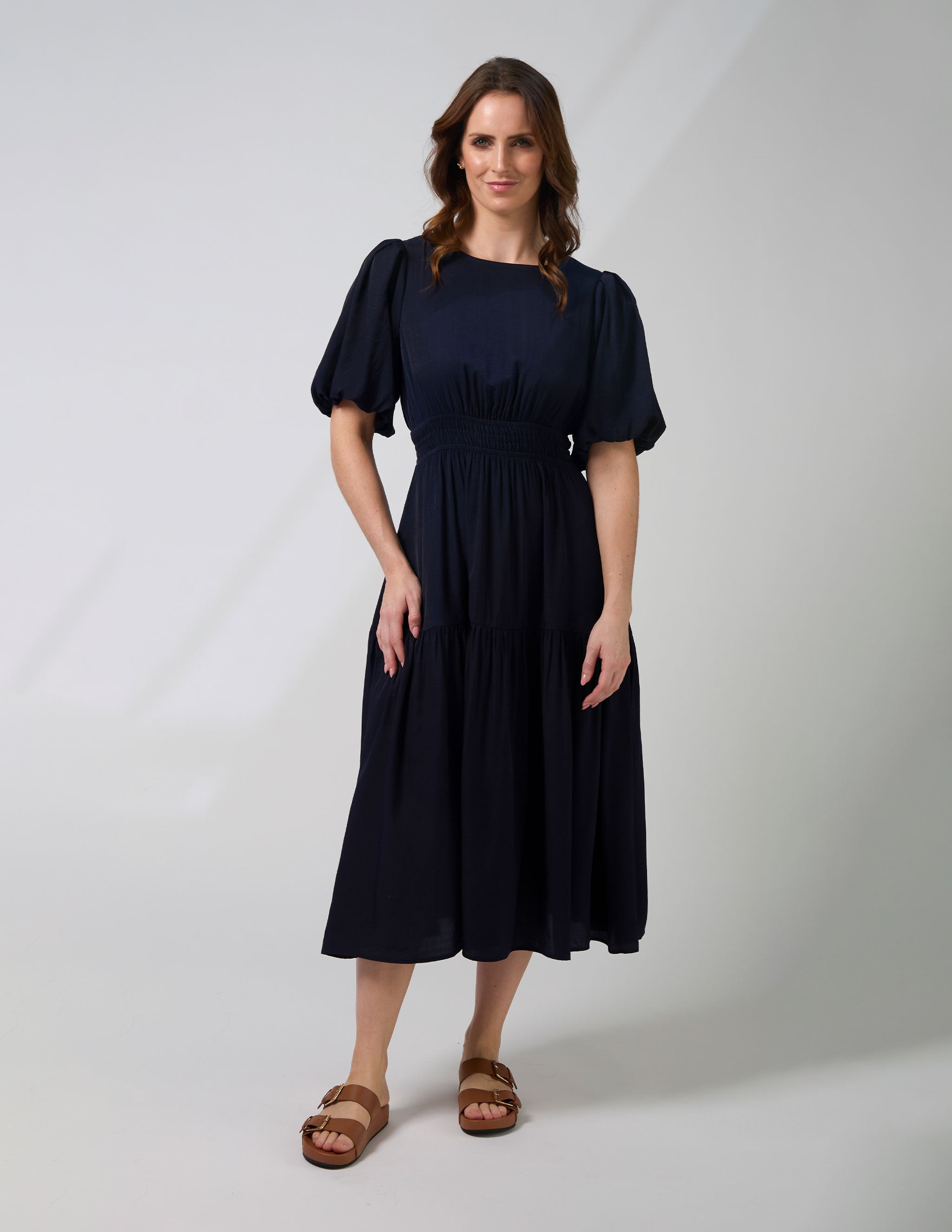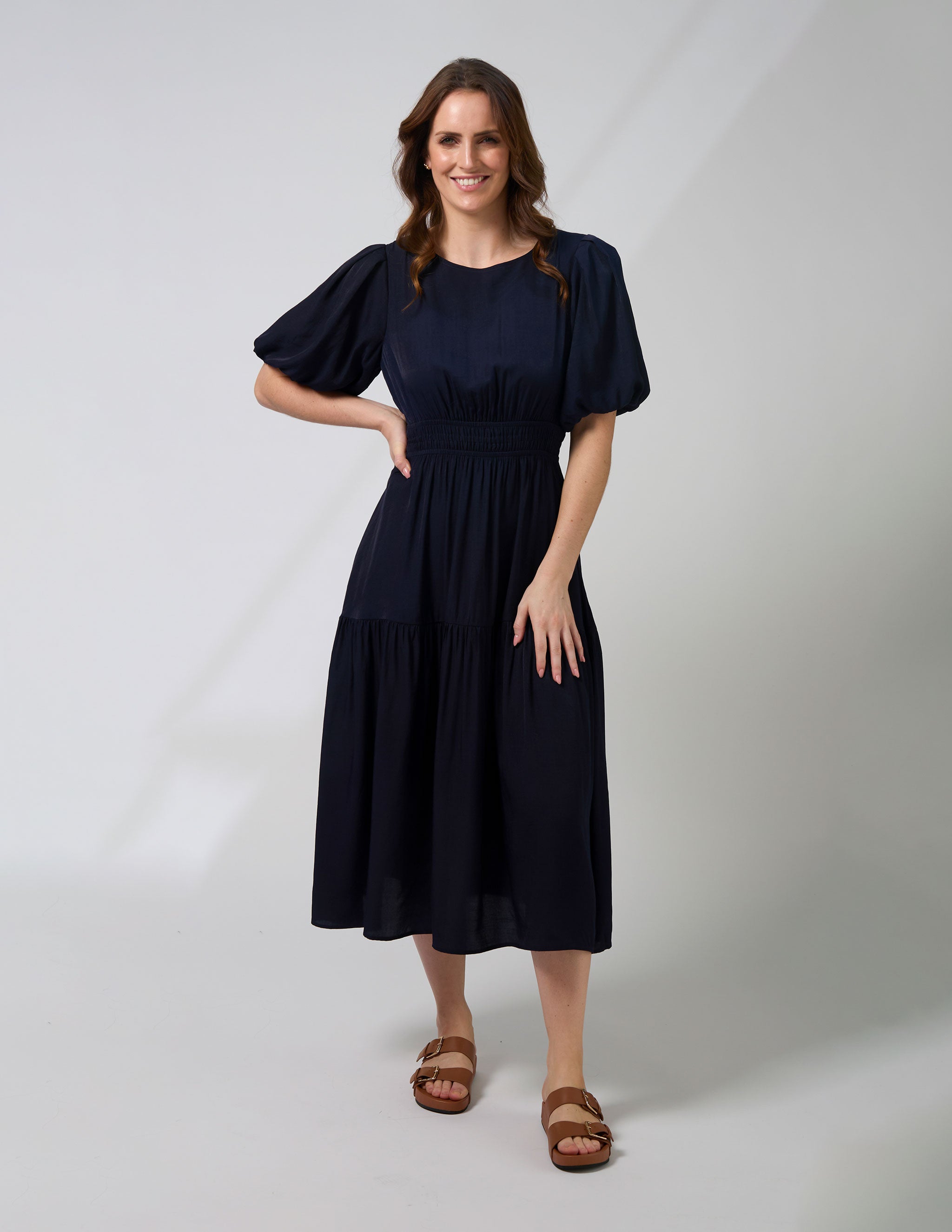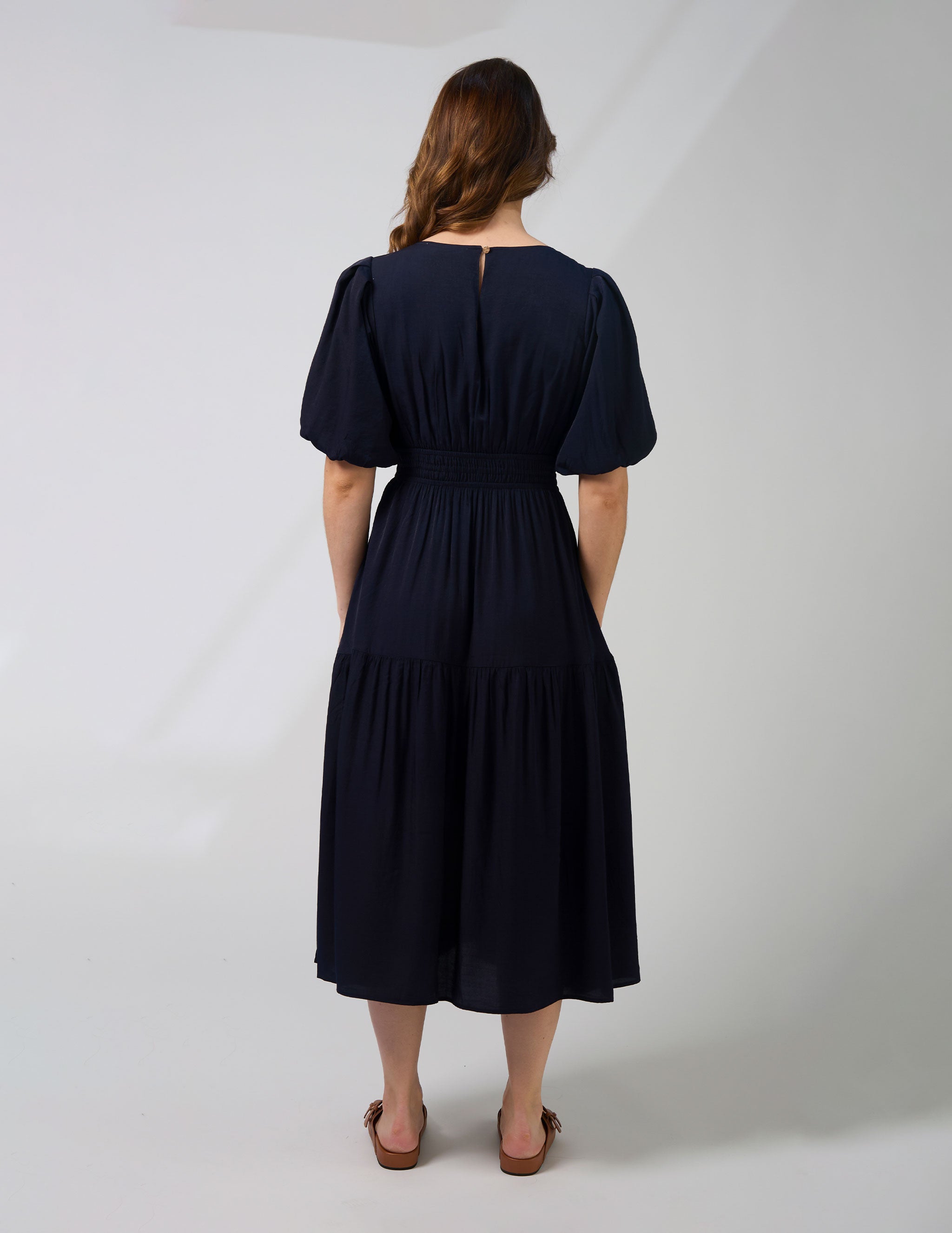 Middie length tiered dress with elasticated row detail through waistline and full sleeve with bubble hem finish and sleeve head gathering. Back neck keyhole split with gold logo button fastening